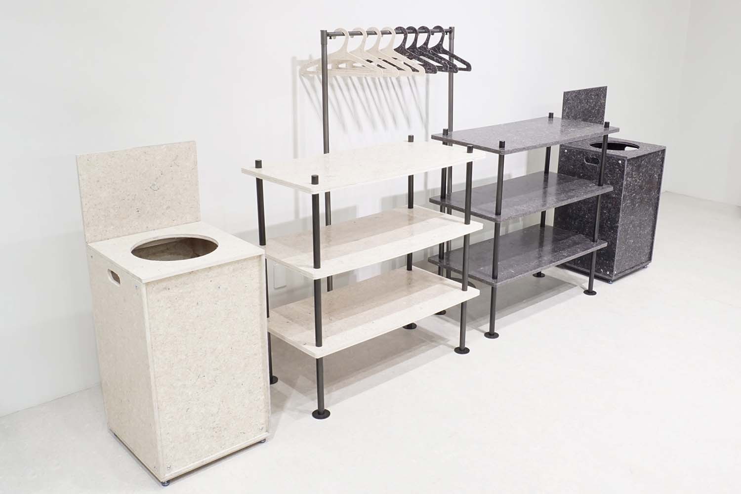 こちらの什器に使用されている素材は、100%繊維系廃材からできたリサイクル素材。