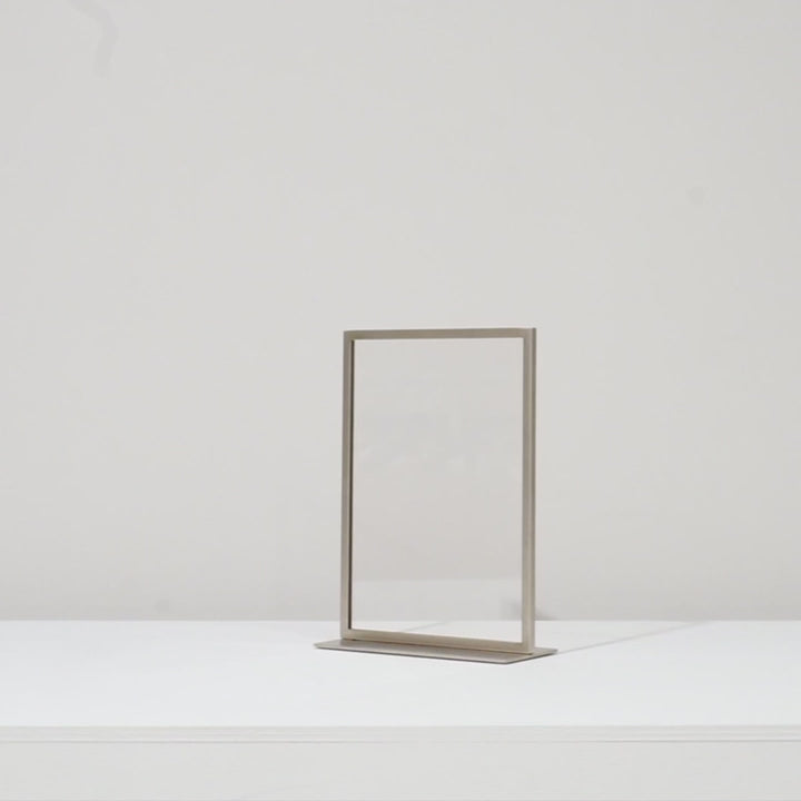 卓上ポップスタンド(ポップ立て)は、ディスプレイテーブルや陳列棚、レジカウンターなどでポップをディスプレイするためのものです。よくあるアクリルだけでできたポップ立ては安っぽく感じる場合もあります。金属フレームとアクリル板を組み合わせることで、シンプルでありながらおしゃれなデザインを実現しました。